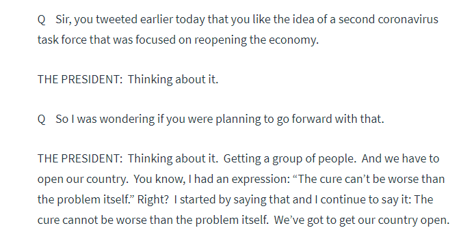 三是在回答经济问题时,特朗普仍在考虑重启经济。他说:我们必须让我们的国家开放。
