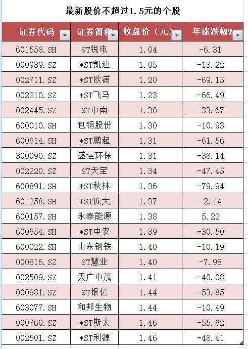 A股还有很多处于面值退市边缘的股票。Wind数据显示,截至12月16日收盘,A股共有20只个股的股价低于1.5元(剔除停牌股与退市股)。一旦跌破其面值连续20个交易日,这些股票也将开始退市倒计时。