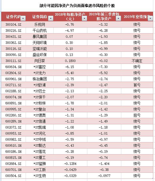 非创业板公司方面,2018年每股净资产为负且三季报每股净资产为负的,共有19家公司,其中包括18只*ST股票。