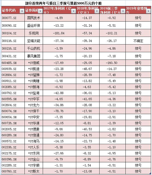 此外,连续亏损的公司也在警惕之列。Wind数据显示,此前连续两年亏损且三季报亏损超过5000万元的股票,目前共有26只,包括19只*ST股票和7只创业板股票。