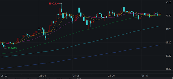 金价在5月初和6月中旬两次接近3460美元,但始终未能更进一步。截至今日发稿,国际金价在3340美元附近窄幅震荡。