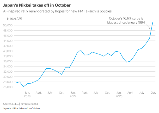 近月来,科技股已成为日经指数持续攀升的核心动力,全球股市在对AI的炽热期待中重焕生机。本月,日本市场更获新首相高市早苗推行积极财政刺激政策的预期加持。