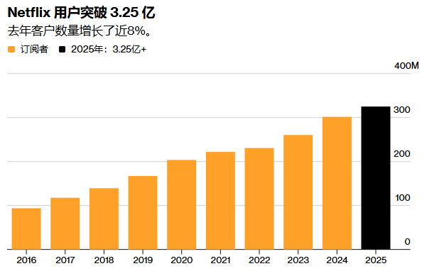 这家流媒体巨头周二表示,计划在2026年将电影和电视节目的支出增加10%,同时推进收购华纳兄弟影业及其流媒体业务的计划。这项交易将使全球两大娱乐公司强强联合。奈飞去年在节目制作方面的支出约为180亿美元。奈飞已停止定期更新其用户总数,引导投资者关注更传统的财务指标。然而,在其第四季度财报中,该公司表示其付费会员数量已突破 3.25 亿,增长近8%,这一数字是 Disney+ 的两倍多。