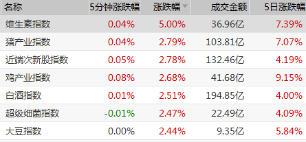 除维生素外,与涨价相关的题材猪产业、鸡产业指数今日涨幅排名靠前,涨幅均在2%以上,概念股傲农生物涨停,正邦科技、益生股份、温氏股份均大涨5%以上。盘后资金流向显示,养殖股中正邦科技主力资金净流入4.26亿元,新希望、温氏股份、牧原股份净流入资金均在亿元左右;维生素概念股中浙江医药、新和成、金达威净流入资金均超亿元。