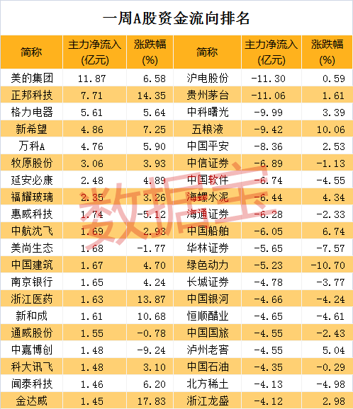 个股方面,剔除近一个月上市的次新股,本周39股主力资金净流入超亿元。美的集团主力资金净流入11.87亿元居首,该股本周上涨6.58%。猪肉概念股正邦科技本周主力资金净流入7.71亿元,本周上涨14.35%,该股今日上涨6.72%,最新收盘价重新站上60日线。格力电器主力资金净流入5.61亿元,本周累计上涨5.64%。本周净流入规模居前的还有新希望、万科A、牧原股份、延安必康、福耀玻璃等。