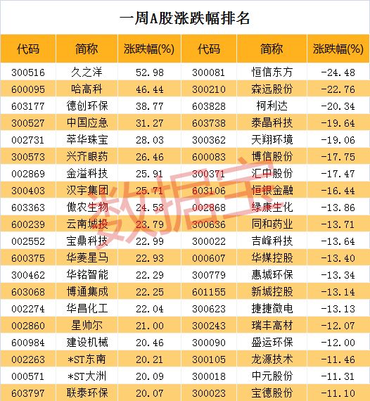 从七月份第一周个股表现来看,数据宝统计显示,剔除近一个月上市的次新股,本周共21股累计涨幅在20%以上。久之洋本周累计涨幅52.98%,成为涨幅榜冠军。