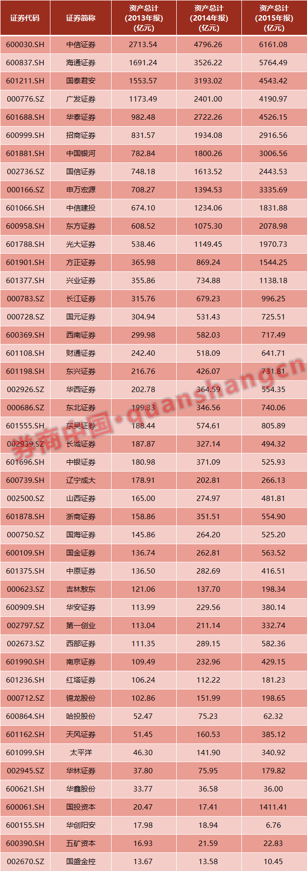 2014年底到2015年初,券商股有一波非常猛烈的上涨。背后的根源其实并不是降息(降息只是诱因),而是资产负债表的迅猛扩张。从2013年到2014年,中信证券的总资产扩张了2000多亿元;海通、华泰、国君、广发等总资产在一年之内全部翻部。
