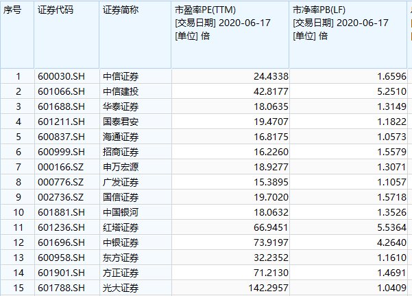 券商股的第二个支撑就是估值。有老牌的非银研究员表示,券商股安不安全看估值,估值低不低看光大。本周一,光大证券涨停。而在上涨之前,光大最低股价仅为10.87元,而其净资产为10.51元,若加上2020年的预期收益,估计该公司PB为1倍。在这个位置上看券商,通常是安全的,也是便宜的。其实,整体来看,无论是PB还是PE,券商股在6月17日收盘都并不算高。