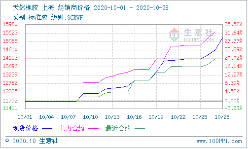 十月至今,天然橡胶期现货一路上行态势,28日沪胶一开盘强势冲高,轻松涨停,01合约收盘16535元/吨,大涨935元/吨,日内涨幅近千元,市场普遍看涨。