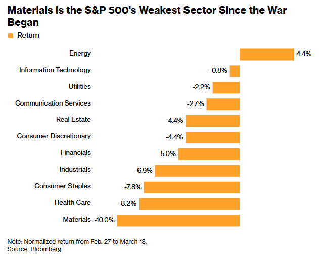 原材料板块成为中东战争爆发以来标普500指数中表现最差的板块