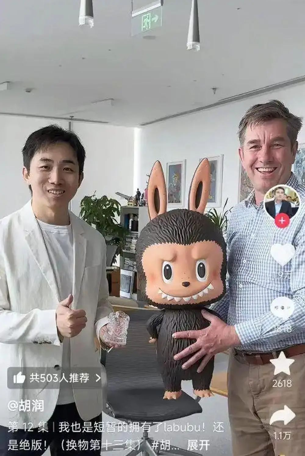 视频中,胡润将LABUBU以及张朝阳送的一块半马奖牌,给了小马智行联合创始人兼CEO彭军,最终交换了一台车。