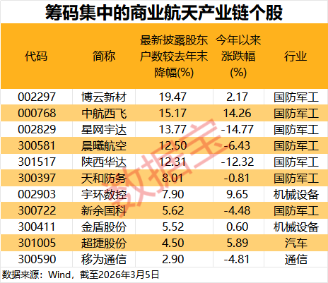 5只个股股东户数下降幅度超过10%,分别是博云新材、中航西飞、星网宇达、晨曦航空、陕西华达。