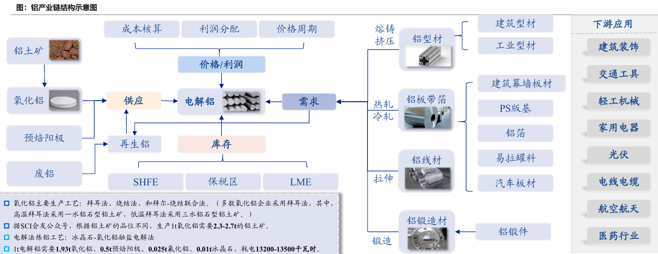 铝产业链包括“铝土矿-氧化铝-电解铝-铝制品-再生铝”等几个环节。从开采得到的含铝矿石中制备得到氧化铝,然后以氧化铝、烧碱等为原料,用熔盐电解的方式冶炼制取原铝(电解铝),再通过压延、挤压等方式进一步加工成铝带箔、铝型材、铝合金等产品,相关产品主要应用于建筑、交通、电力电子、耐用消费品等下游行业。1吨电解铝需要1.93吨的氧化铝和0.5吨的预焙阳极。根据铝土矿的品位不同,生产1吨氧化铝需要2.3-2.7吨的铝土矿。所以铝土矿是生产氧化铝的核心要素。