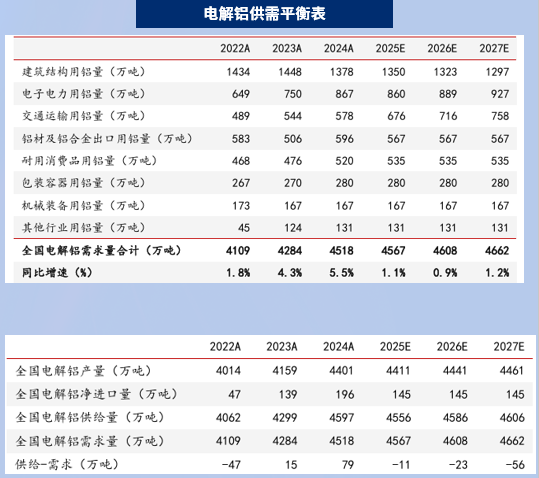 我们预计2025-2027年全国电解铝需求量分别4567/4608/4662万吨,分别同比增加49/42/53万吨;其中,2025-2027年建筑结构用铝量分别为1350/1323/1297万吨、电子电力用铝量分别为860/889/927万吨、交通运输用铝量分别为676/716/758万吨;2025年铝材及铝合金出口/耐用消费品/包装容器/机械装备/其他行业用铝量分别为567/535/280/167/131万吨。
