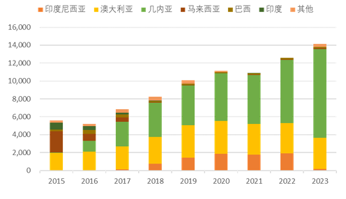 全球铝土矿资源分布呈明显的区域性集中特征。铝土矿并无资源稀缺属性,全球铝土矿总资源储量约550-750亿吨,其中已探明储量约300亿吨,全球铝土矿年产量约4亿吨左右(2023),铝土矿的当前储量至少可以满足全球铝工业约75年的需求。但另一方面,尽管铝土矿储量巨大,但分布却具有明显的区域性特点。全球已知有铝土矿资源的国家有49个,几内亚(74亿吨,24.9%)、越南(58亿吨,19.5%)及澳大利亚(35亿吨,11.8%)合计占全球铝土矿资源总量的56.1%(CR3)。此外,亚洲地区的印度尼西亚(10亿吨,3.4%)、中国(7.1亿吨,2.4%)及印度(6.5亿吨,2.2%)有铝土矿资源分布。