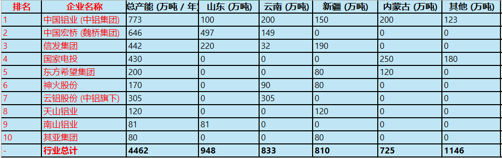 中国铝业:中央管理的国有重要骨干企业中国铝业集团有限公司,旗下中国铝业股份有限公司2001年上市,全球电解铝龙头企业。资产规模:、营业收入5176亿元,全球地位:全球最大的氧化铝、电解铝、精细氧化铝和高纯铝生产企业,电解铝:总产能约786万吨/年,分布于山东、云南、内蒙古、山西等地,氧化铝:产能2226万吨/年,全球市占率约21.5%,产业链:拥有铝土矿资源约18亿吨,构建“铝土矿-氧化铝-电解铝-铝加工”全产业链。