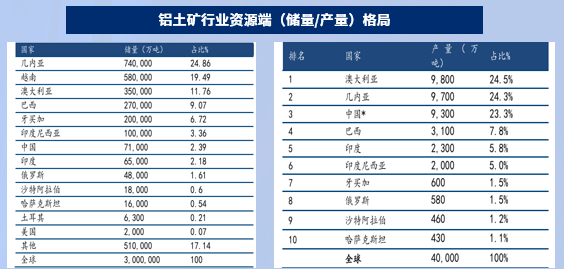 中国的铝冶炼产能在全球占据绝对优势,全球电解铝产能近六成在中国。全球电解铝产能约为8000万吨,全年总产量在7261万吨,其中我国电解铝产量将达到4307万吨,占全球比例近60%,铝材产量占比更达到66%,原铝产量约为第二名印度的十倍,超过剩余其他国家的产量总和。 我国电解铝行业受限于约4500万吨的产能天花板。2024年国内电解铝总产量在4310万吨左右,全年平均开工率约95%,电解铝供需结构保持基本平衡状态。但是我国铝土矿产能严重不足,这块需要从海外进口铝土矿。 中国铝土矿进口量突破1.4亿吨(1.416亿吨),相当于自身年产量的2.16倍,预期2025年的中国铝土矿进口量或会迫近1.69亿吨。中国铝土矿进口来源地亦呈高集中度特点。当前国内铝土矿的进口来源集中于几内亚及澳大利亚,二者占中国铝土矿进口总比例超过94.7%,其中几内亚占比超过70%,澳大利亚占比约24.5%。所以我国铝土矿进口情况很容易受到海外铝土矿出口政策和产能情况影响。进而影响电解铝的成本价格情况。 全球铝土矿产能分布/我国进口铝土矿主要国家分布 |