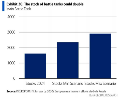 国防金属需求估算面临挑战:各国鲜少公布详细支出细项,且装备的金属含量难以精确量化。然而,北约支出目标的升级是关键驱动因素。2024年,北约国家(除美国外)在核心国防上的支出为5070亿美元;若达到3.5%的GDP目标,将额外增加3710亿美元支出。