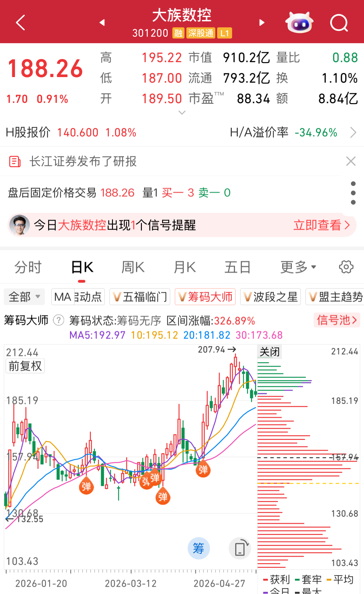 注:主升浪并非完全无迹可寻!“筹码大师”显示,大族数控在3月份阶段性低点位置连续出现“弹”,随后连续大涨!股价创历史新高!更多学习案例参考,尽在“筹码大师”!点击详情>>