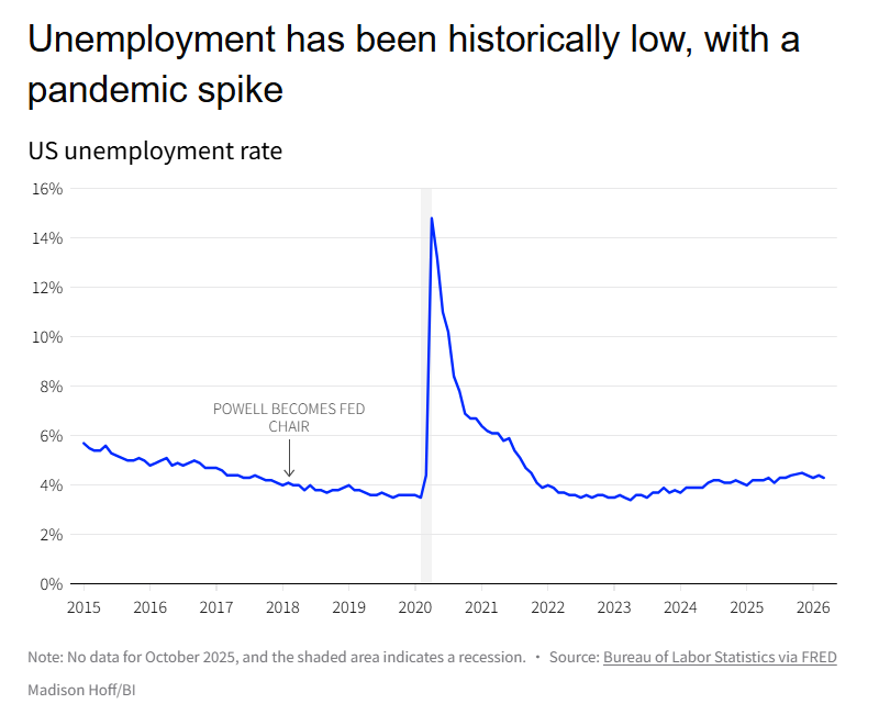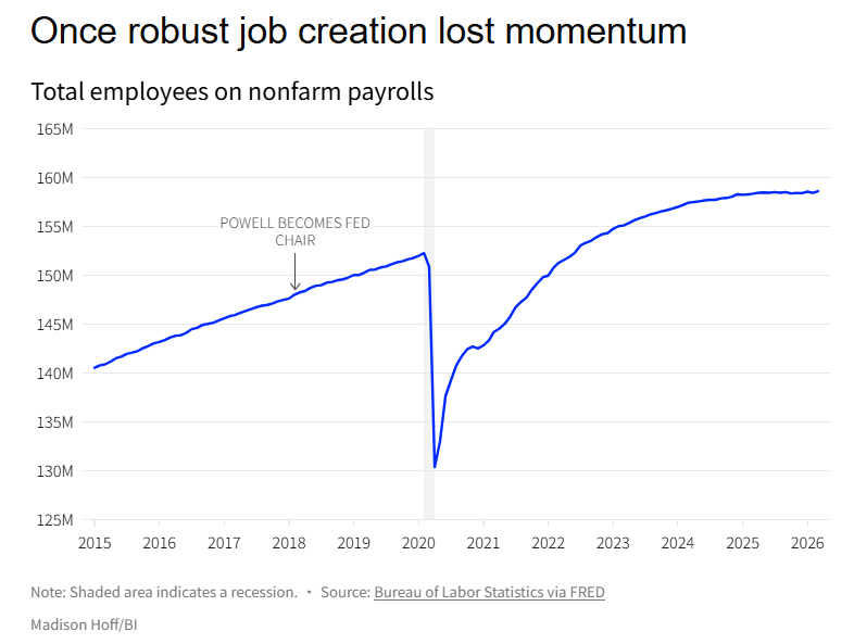 在鲍威尔任期内,就业市场面临了一连串的逆风:疫情、移民放缓以及为应对持续通胀而推行的高借贷成本政策。