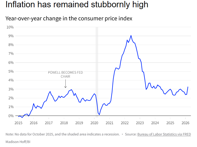 2020年底,美国CPI通胀率约为1%,但到2022年6月飙升至9.1%。进入2026年初,通胀一度回落至接近2%,但受伊朗局势影响,3月再度抬头。