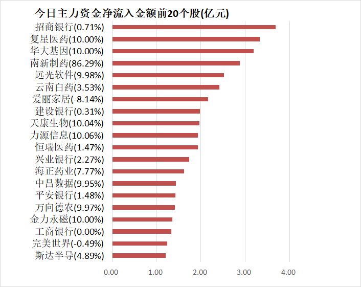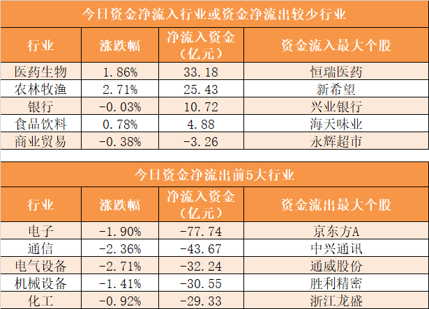 28个申万一级行业中,4个行业实现资金净流入,其中医药生物行业净流入33.18亿元居首。