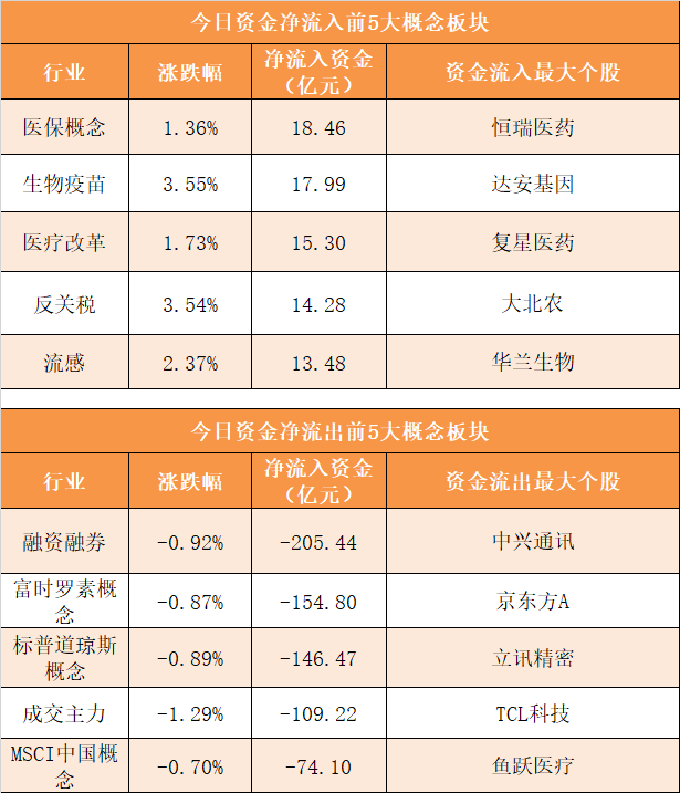 概念板块方面,今日医保概念、生物疫苗、医疗改革、反关税等概念板块资金呈现净流入,其中医保概念净流入18.46亿元居首。