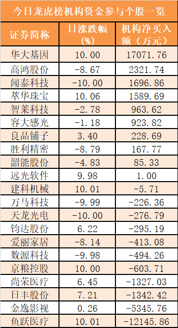 盘后龙虎榜数据显示,机构现身21股,其中华大基因等10股呈现机构资金净买入,鱼跃医疗等11股呈现机构资金净卖出。
