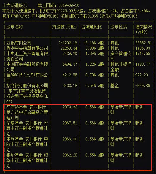 立讯精密三季度被证金、汇金大手笔买入,最新持股数量达2.58亿股。按最新收盘价计算,持股市值达82.44亿元 ,是当前三季度国家队增持数量最多的个股。立讯精密主要生产经营连接线、连接器、射频天线、蓝牙耳机等零组件、模组与配件类产品.公司在手机领域的客户涵盖全球手机前六强,目前除了苹果是公司的第一大客户外,华为、OPPO、vivo和小米等中国手机主流品牌厂家也均为立讯精密重要客户。2019年前三季公司实现营业收入378.36亿元,同比增长70.96%;归母净利润28.88亿元,同比增长74.26%;第三季度实现营业收入163.59亿元,同比增长62.24%,归母净利润13.86亿元,同比增长61.86%。市场表现来看,公司年初至今来累计涨幅近2倍,三季度涨幅超40%,最新收盘价续创历史新高。从前十大流通股东来看,该股三季度受到证金的青睐,证金通过4个资管计划新进为前十大流通中的四个流通股东。