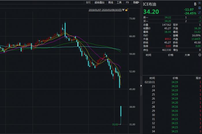 3月9日亚太时间开盘后,布油直接跳空大幅低开,最低跌至31.02美元/桶。