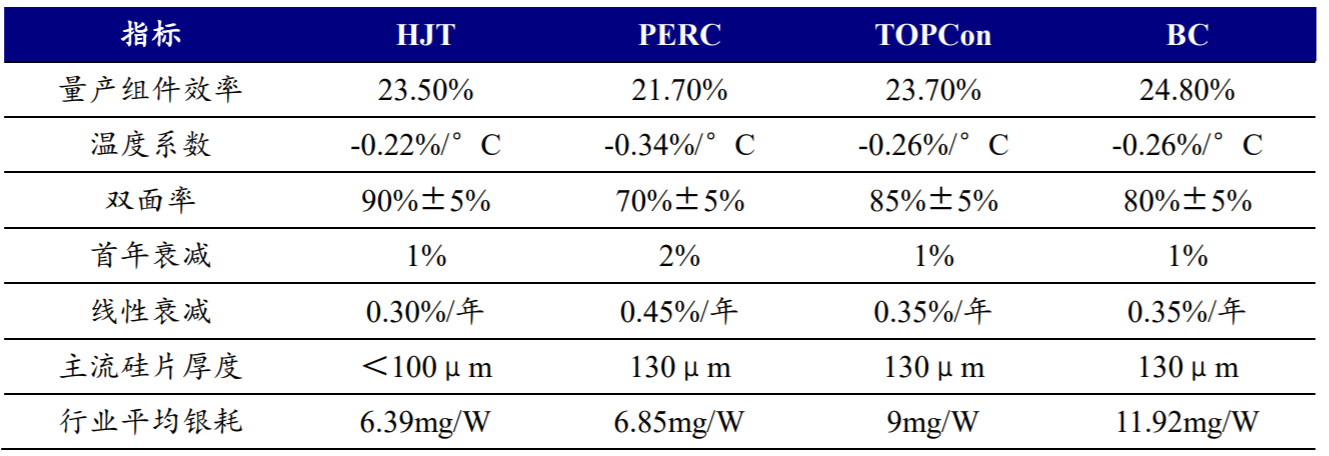 低衰减及低温度系数:当前主流HJT组件首年衰减率仅为 1%,全生命周期线性衰减率低于 0.3%/年,综合衰减表现优于PERC、TOPCon等其他晶硅电池技术路线。在温度系数方面,主 流 HJT 组件温度系数低至-0.22%/°C,相较 PERC(-0.34%/°C)、TOPCon(-0.26%/°C)及 BC 电池(-0.26%/°C)具备比较优势,更适合太空环境。