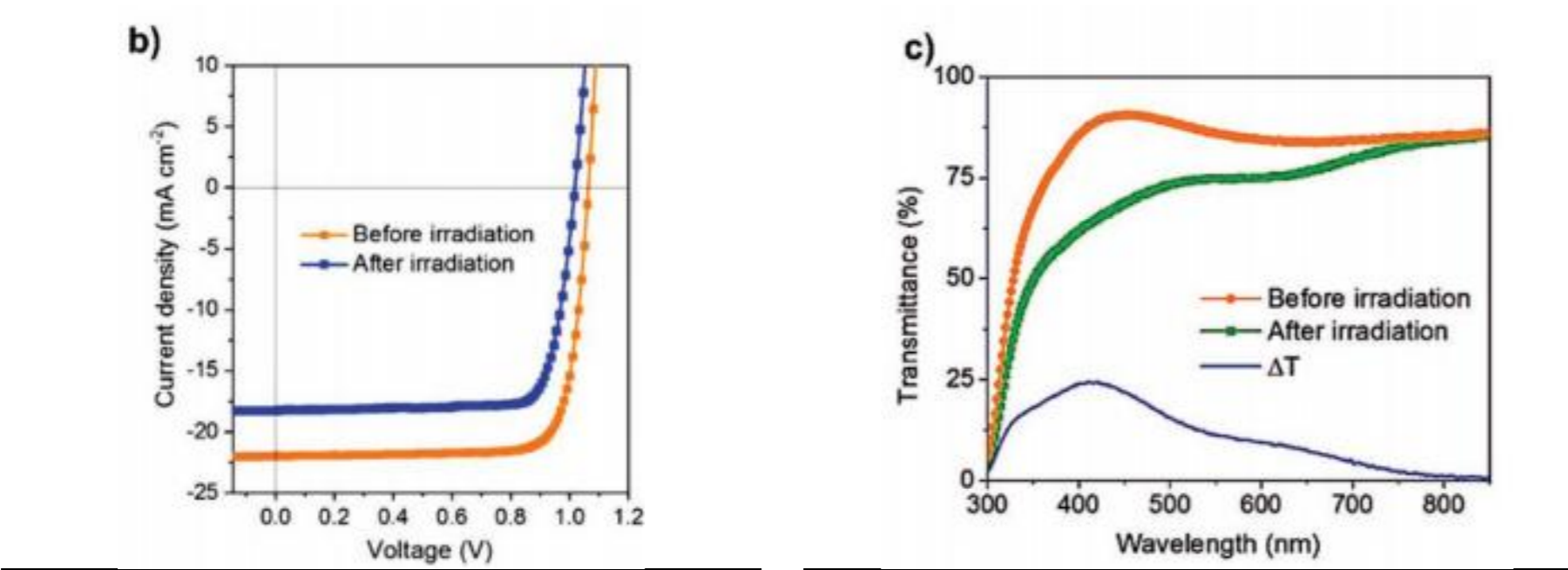 图:高剂量γ射线辐射前后J–V曲线(左),辐照前后透射率变化(右) |