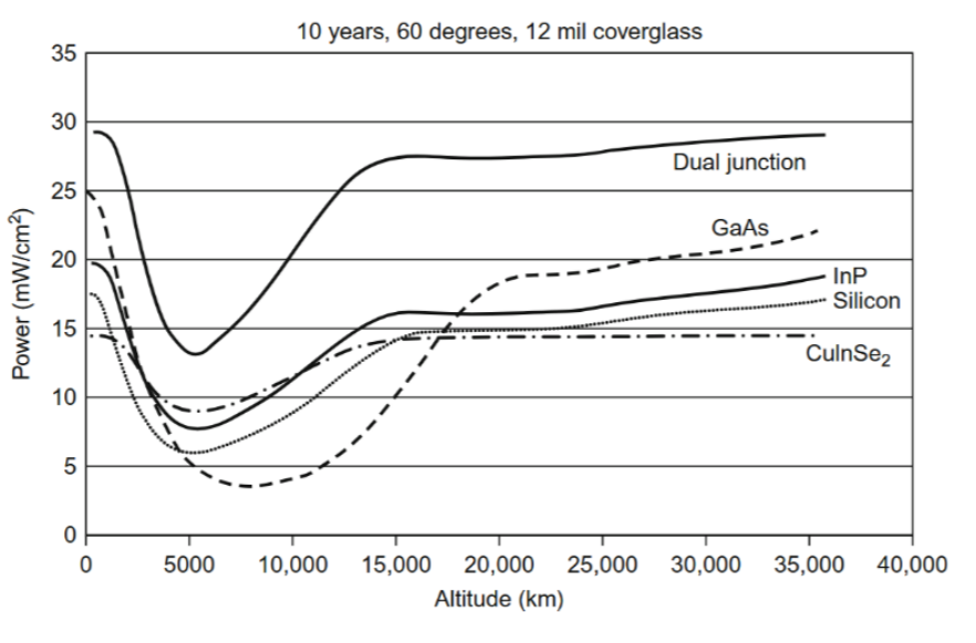 图:光谱分布的改变会导致电池整体转换效率下降(左),低中轨道的高辐射对光伏电池功率影响很大 |