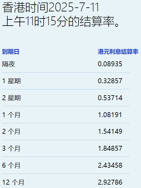 隔夜息报0.08935%,升1.822基点。一周拆息跌0.072基点,报0.32857%,两周期则升1.678基点,报0.53714%。长息方面,六个月及一年期分别升3.023基点及3.101基点,报2.43458%及2.92786%。
