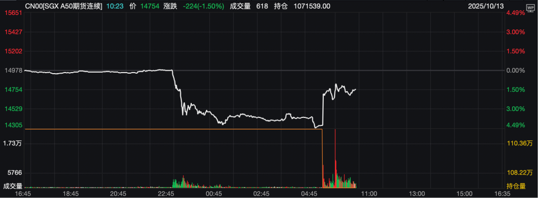 此外,富时中国A50指数期货在上一交易日夜盘收跌4.26%的基础上高开,随后亦持续收窄跌幅,目前跌幅在1.5%左右。