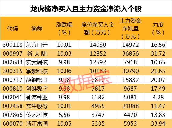 速看!龙虎榜净买入且主力资金净流入个股一览