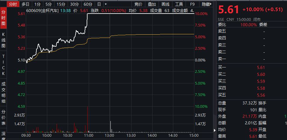 华晨中国短线上扬,盘中涨幅扩大至近10%,截至收盘,股价报收7.48港元,收涨8.25%。A股市场方面,申华控股和金杯汽车涨停。