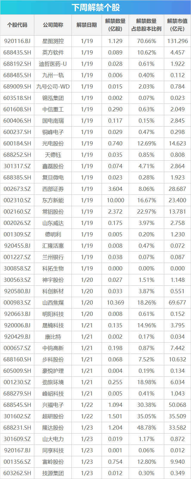 其中,解禁市值居前三位的是:星图测控(131.3亿元)、山西焦煤(69.68亿元)、兴福电子(50.07亿元)。从个股的解禁量看,解禁股数居前三位的是:山西焦煤(10.37亿股)、东方新能(10亿股)、西部证券(3.6亿股)。