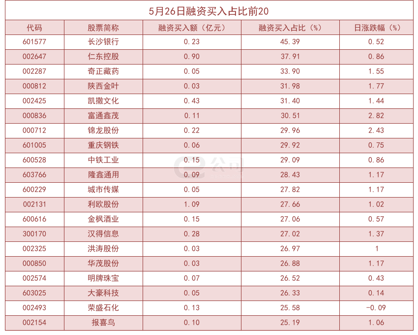 个股方面,沪深两市共有1583只个股有融资资金买入。从融资买入额占当日总成交金额比重来看,共有93只股票融资买入额占比超20%,其中长沙银行(45.39%)、仁东控股(37.91%)、奇正藏药(33.90%)排名前三。