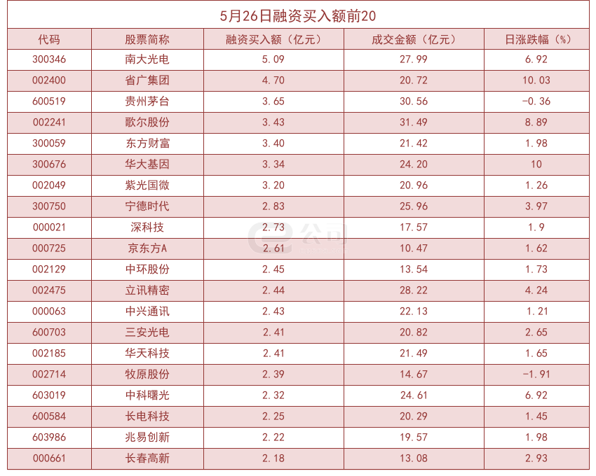 从融资资金买入金额来看,共有73只个股买入金额超亿元,其中南大光电(5.09亿元)、省广集团(4.70亿元)、贵州茅台(3.65亿元)居前三位。