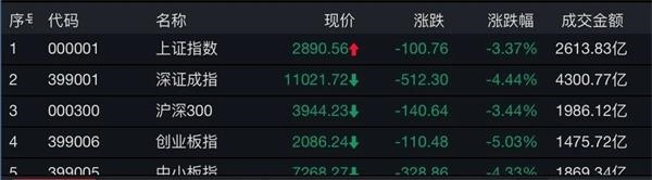 数据显示,截至午间收盘,上证指数跌3.37%,报2890.56点;深证成指跌4.44%,报11021.72点;创业板指跌5.03%,报2086.24点。