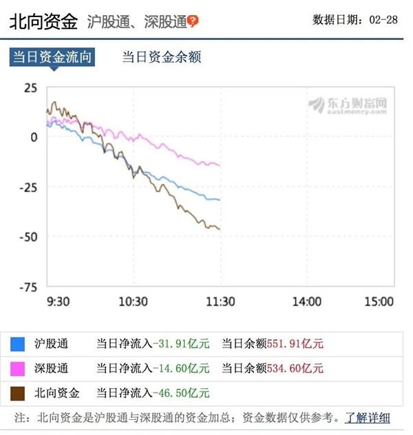 北向资金延续净流出态势。据东方财富网数据,截至28日午间收盘,北向资金合计净流出46.50亿元,其中沪股通净流出31.91亿元,深股通净流出14.60亿元。