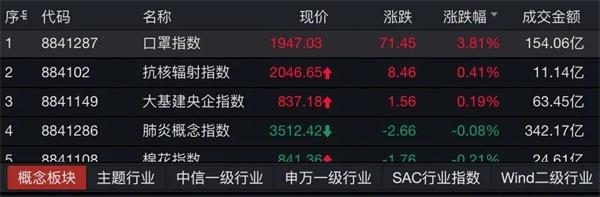 概念板块中,口罩概念一枝独秀。截至午间收盘,口罩概念板块大涨3.81%,抗核辐射概念板块跟涨0.41%。