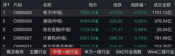 中信一级行业板块午间收盘全线下跌。其中,科技股跌幅居前。数据显示,电子指数早盘以6.51%的跌幅领跌,通信、计算机指数纷纷跟跌。