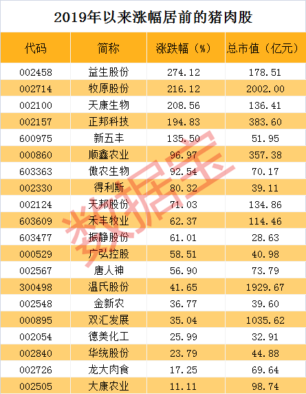 证券时报·数据宝统计显示,2019年以来,猪肉股的平均涨幅高达90.02%,涨幅超过100%的有5只股票,其中涨幅最大的是益生股份,涨幅达274.12%。牧原股份涨幅为216.12%,排名第二,目前总市值为2002亿元,在猪肉股中的市值最大。涨幅第三的是天康生物,为208.56%。