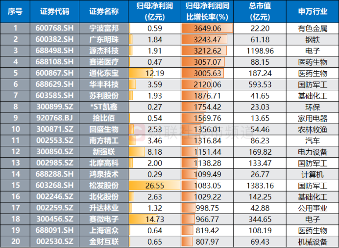 若统计业绩增速,累计共有16股2025年归母净利润同比增速在10倍以上,其中,宁波富邦、广东明珠、源杰科技、赛诺医疗、通化东宝、华丰科技6股业绩增速居前,分别达36.49倍、32.43倍、32.13倍、30.57倍、30.06倍、21.20倍。若剔除扭亏股,2025年归母净利润获翻倍股个股近200只,占比达5.8%,其中,10倍增速股7只。