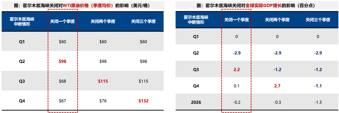 (3)达拉斯联储的模型显示,如果霍尔木兹海峡关闭一个季度且缺少其他缓解途径,将导致2026Q2WTI原油均价上涨至每桶98美元,并使得Q2全球GDP增长率比初始水平下降2.9个百分点——当前较大概率定价的情形:Q2冲击、Q3修复,未实质性衰退。