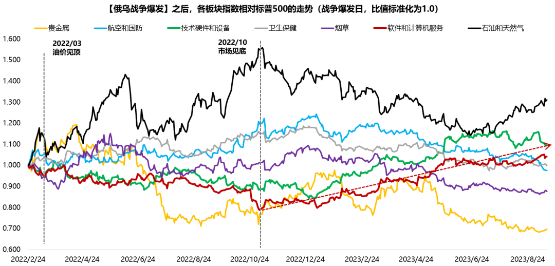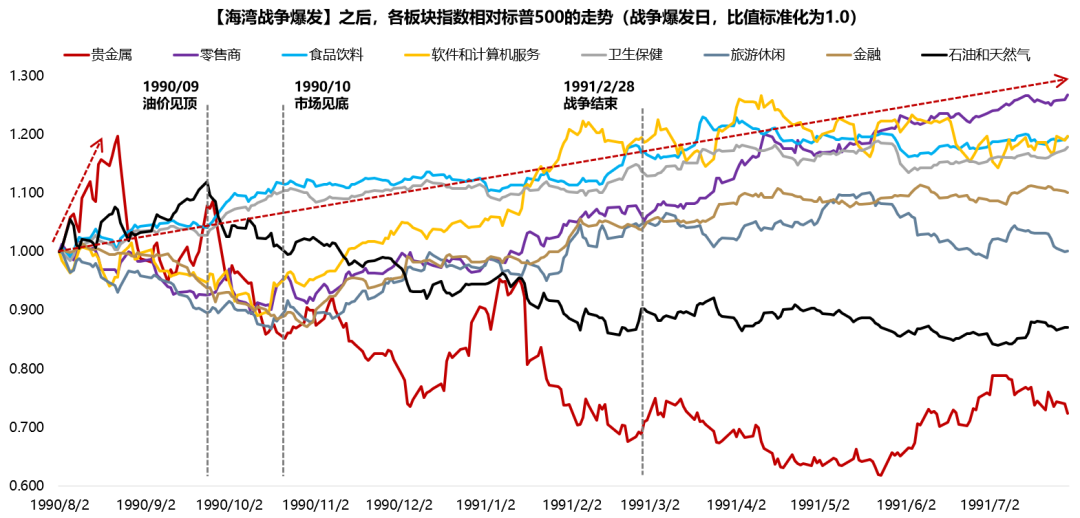(4)若油价脉冲回落,则市场在短暂反映战争因素之后,通常会回到了原有的运行轨道中(每个年代的主线板块不一样),甚至资金还会往景气更确定的方向集中,比如1980年前后的军工、1990年前后的消费、90年代末期的科技。