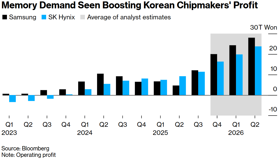 存储器业务曾以剧烈的“繁荣与萧条”周期为特征,但如今该行业正在创造几年前几乎无法想象的利润,从而推高了整个板块的估值。自 9 月初以来,三星股价已飙升约 130%,而 SK 海力士的股价则大致翻了两番。