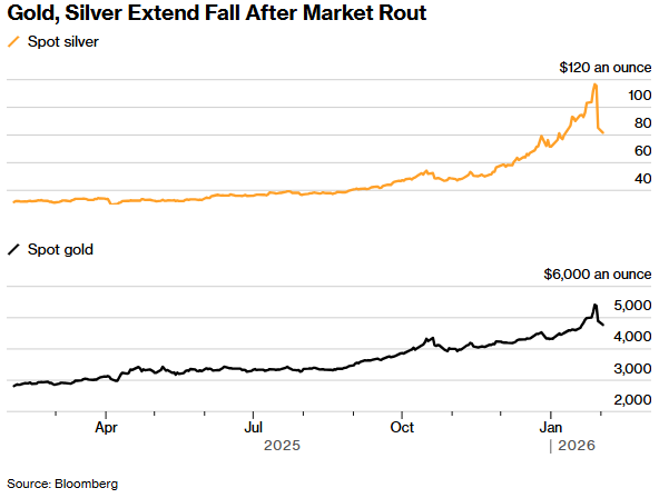 上周五戏剧性抛售的触发因素在于,有消息称美国总统特朗普将提名凯文·沃什执掌美联储。这一消息推动美元走高,并打击了那些押注特朗普愿意让美元走弱的投资者的情绪。交易员将沃什视为最终候选人中最强硬的反通胀斗士,这提高了对将支撑美元、削弱以美元计价贵金属的货币政策的预期。